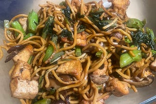 Hetty's hokkien noodles, Yasmin's curried broccoli lentil salad, and Soy Curl al pastor (a la Emma y Kenji)