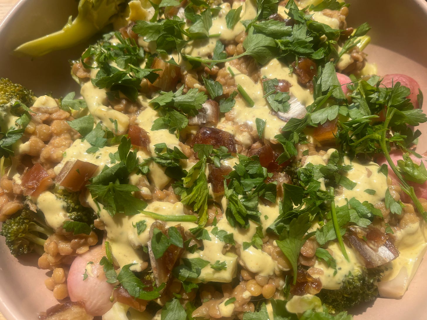 Lunch this week was Yasmin Khan’s Broccoli and Lentil Salad with Curried Tahini and Dates from Sabzi (pg 58). Bookmark this one, it’s like what you want Sweetgreen or Goop Kitchen or your fill-in-the-blank healthy salad office lunch place to be, rather than what it actually is (serviceable to good but never REVELATORY). There are several layers to this dish. If you say “roasted broccoli and lentils,” what words come to mind? Sad… boring… suicidal ideation. Now, what if I told you to roast radishes along with the broccoli? Weird… why… crunchy? But what if the lentils were marinated in olive oil and lemon juice? Not exactly mind-blowing, but you’re listening. Chopped up dates for sweetness, and a little parsley? Starting to see the vision. Here’s the genius part: a tahini dressing mixed with maple syrup and regular grocery store curry powder. If you’re my age, you remember that amazing grocery store raw broccoli salad with raisins, and you also remember that amazing grocery store curried chicken salad with raisins. This is like that, but a million times better and healthier. Wrap it in a carb-savvy tortilla or eat it plain with a fork (if you’re gonna be all WFPB). I might make it again next week.