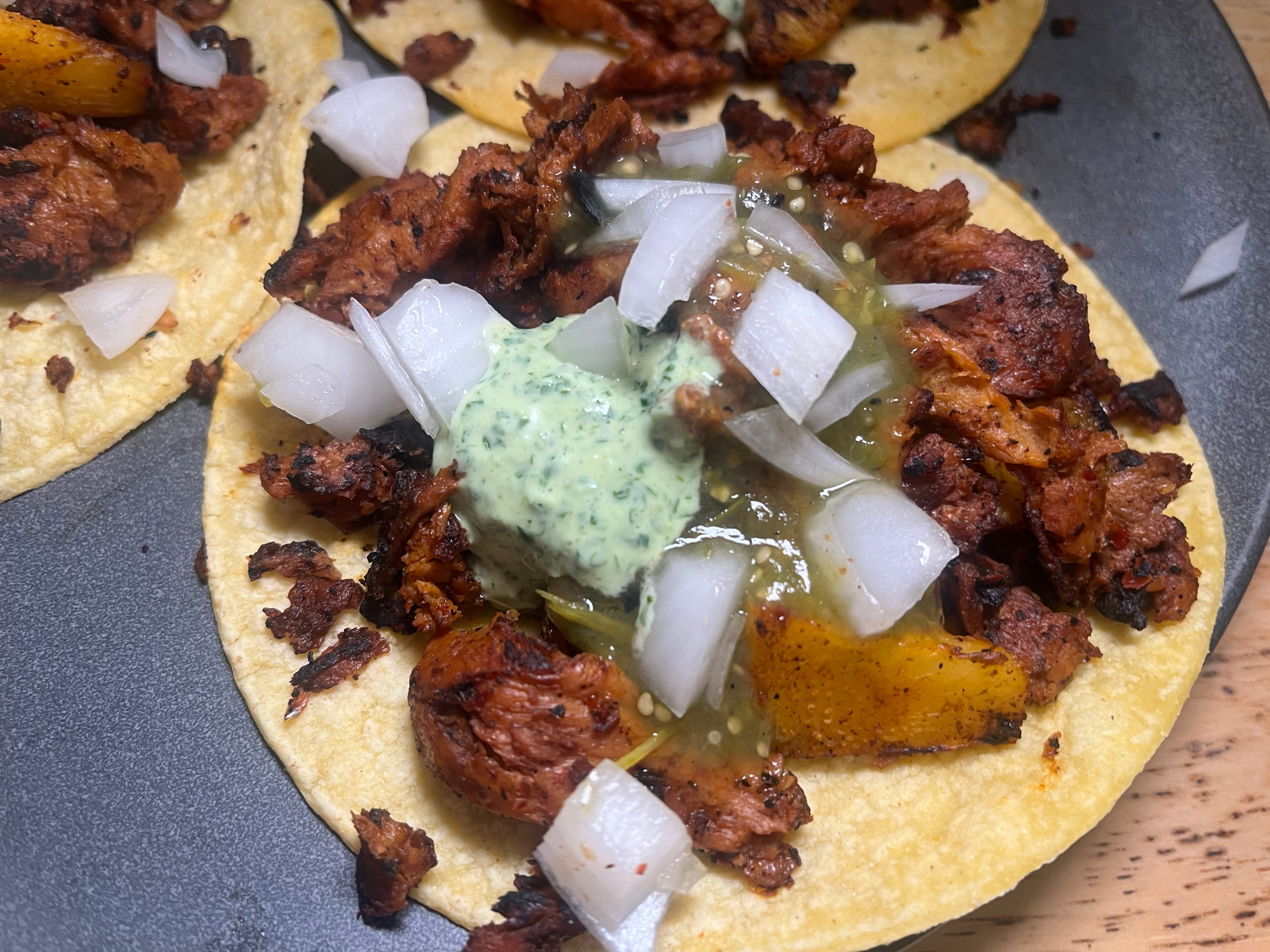 There are a few dishes that make me miss my meat-eating days. One is the classic Halal lamb/chicken (white sauce hot sauce) New York street food plate. Another is the Mexican-American shredded beef crunchy taco topped with shredded cheddar cheese and barely spicy salsa. A third, and perhaps the most immediately painful, living in Los Angeles, is the al pastor street taco freshly shaved off the trompo, dotted with charred pineapple, salsa verde, and raw white onion. Literally DROOL.